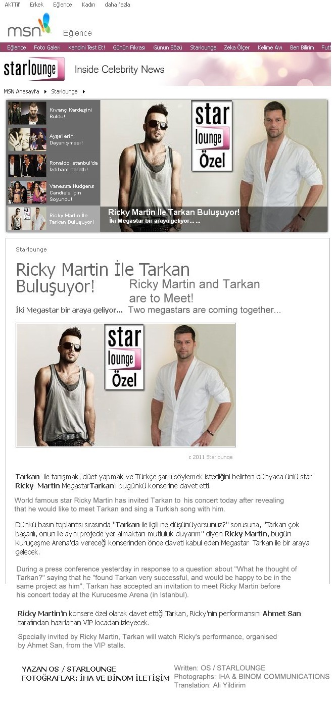 Puerto Rican singer Ricky Martin, in Istanbul for a concert, has given an interview to Turkish newspaper Haberturk's entertainment supplement, Haberturk Magazin, in which he is reported to have said that it would be "an honour" to sing with Tarkan, who has often been cited as the "Ricky Martin of the East".The news follows hot on the heels of of celebrity gossip about Tarkan and another international star in Istanbul recently, Portuguese footballer Cristiano Ronaldo, who has reportedly become a fan of Tarkan's music.